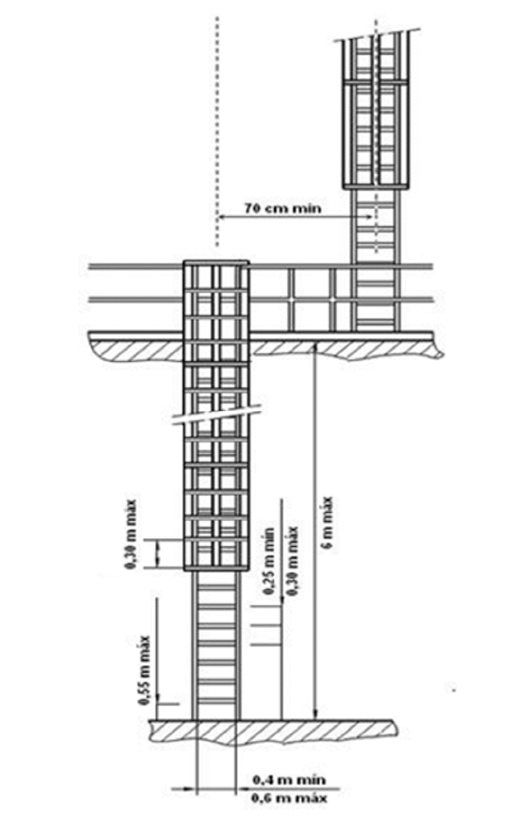 g) altura máxima de 6,00 m (seis metros) entre duas plataformas de descanso, se for de múltiplos lances, construídas em lances consecutivos com eixos paralelos, distanciados no mínimo em 0,70 m (setenta centímetros), conforme Figura 3 do anexo III desta Norma;
